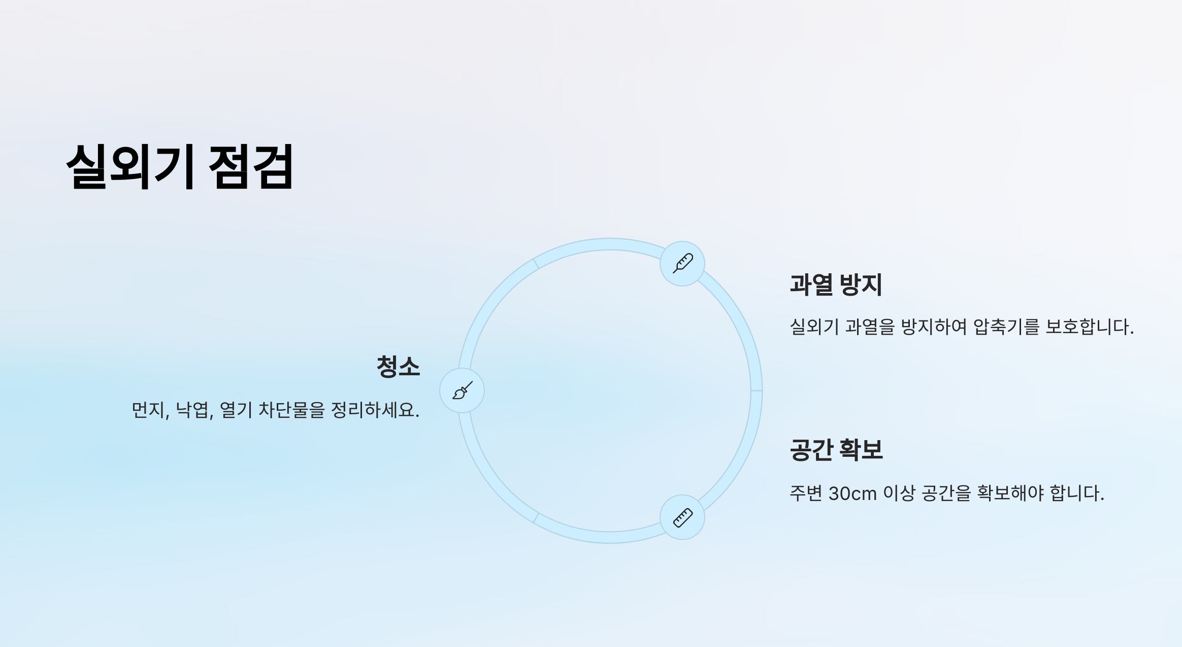 - 냉방 사용 전후 **테스트 가동**으로 이상 유무 확인