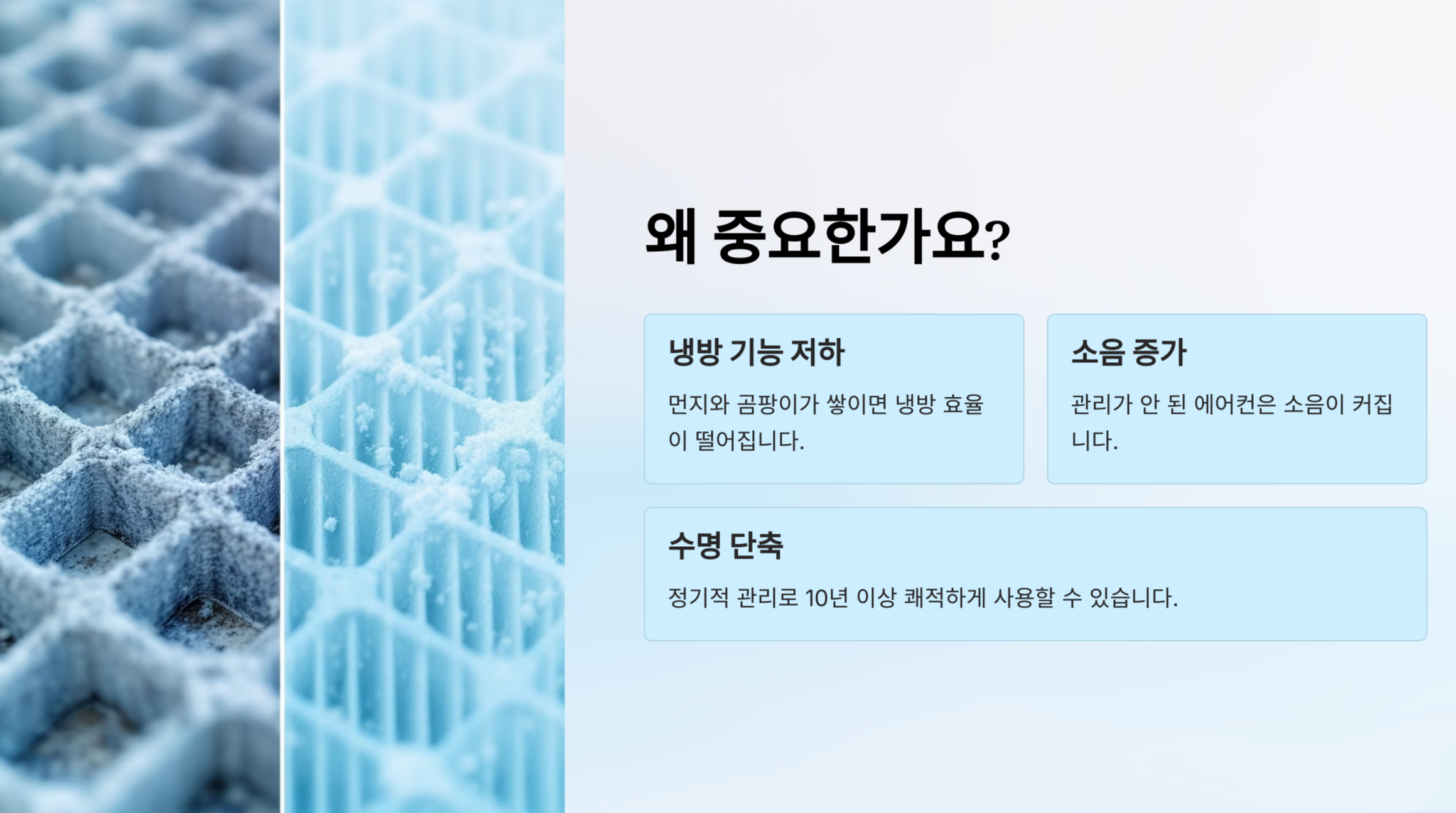 - 먼지 축적 방지 → 냉방 효율 유지