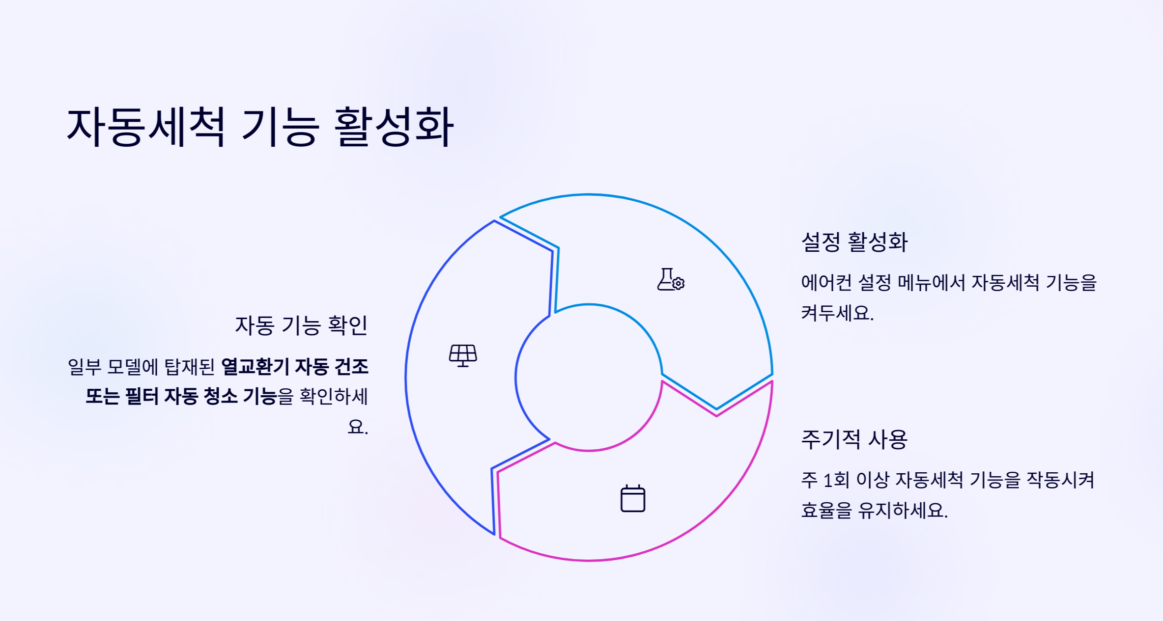 - 일부 모델에 탑재된 열교환기 자동 건조 or 필터 자동 청소 기능 주기적으로 사용