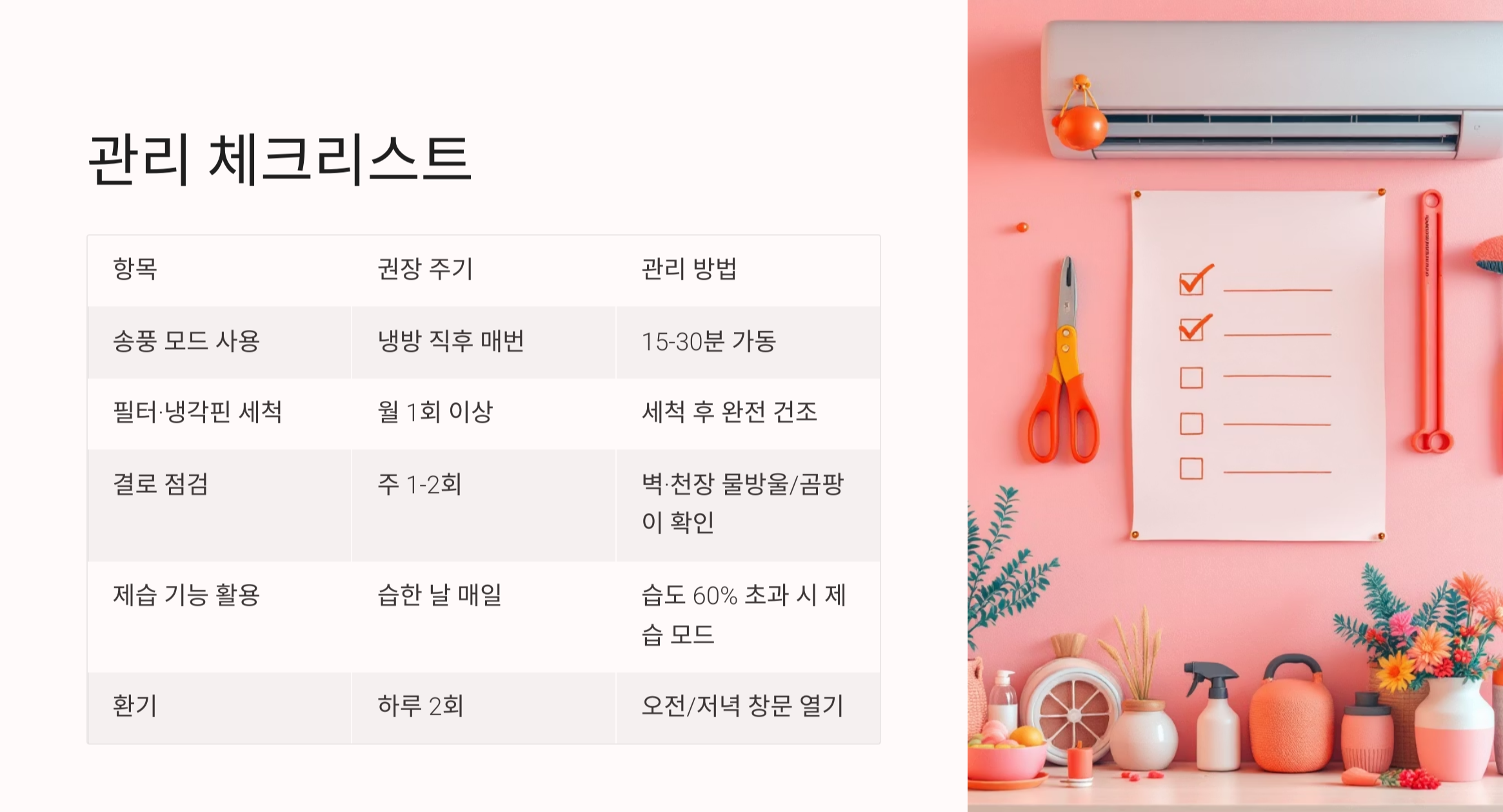 - 냉방 종료 후 반드시 “송풍 모드”로 전환